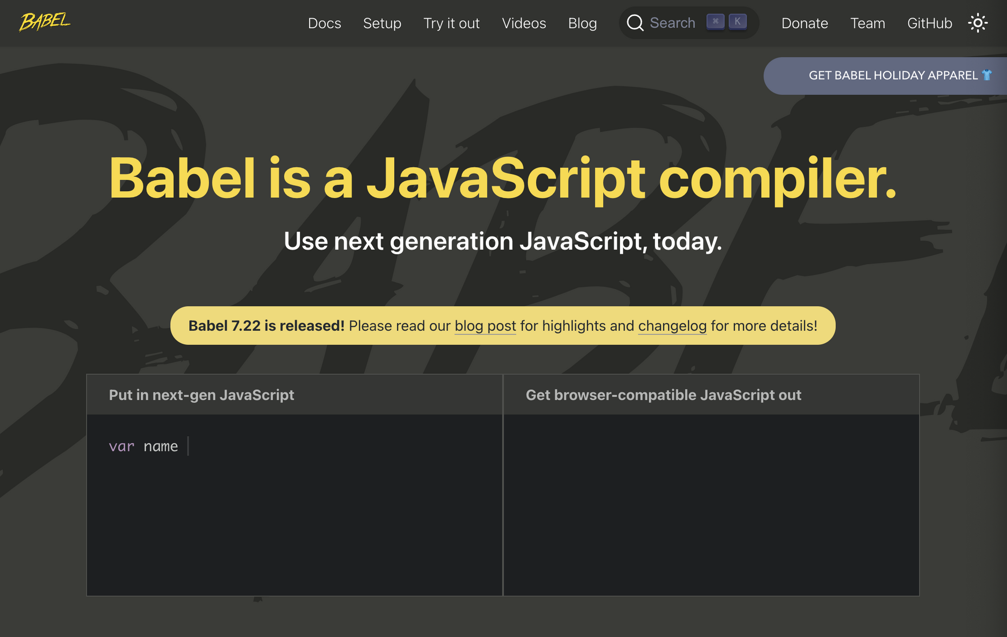 ์ฆ, ECMAScript์ ์ต์ ๋ฒ์ ์ 5๋ 6์ผ๋ก ๋ณํํด์, ๋ณํ๋ ์ฝ๋๋ฅผ ์์ฐํด ์ฃผ๋ Transcompiler๊ฐ ๋ฐ๋ก ๊ทธ ์ ๋ช ํ Babel์ด๋ค.