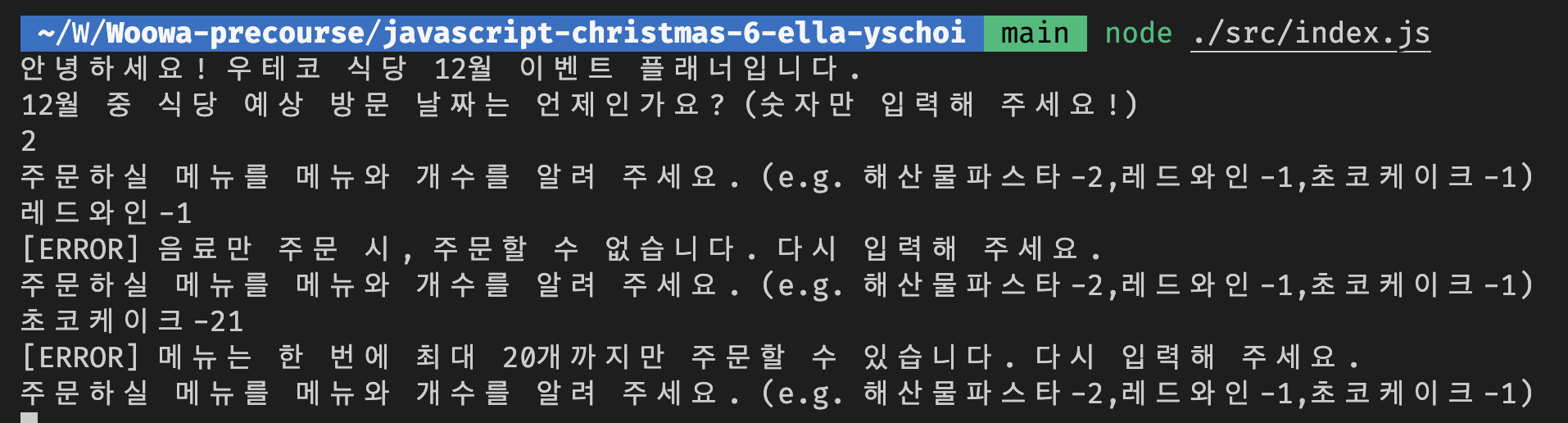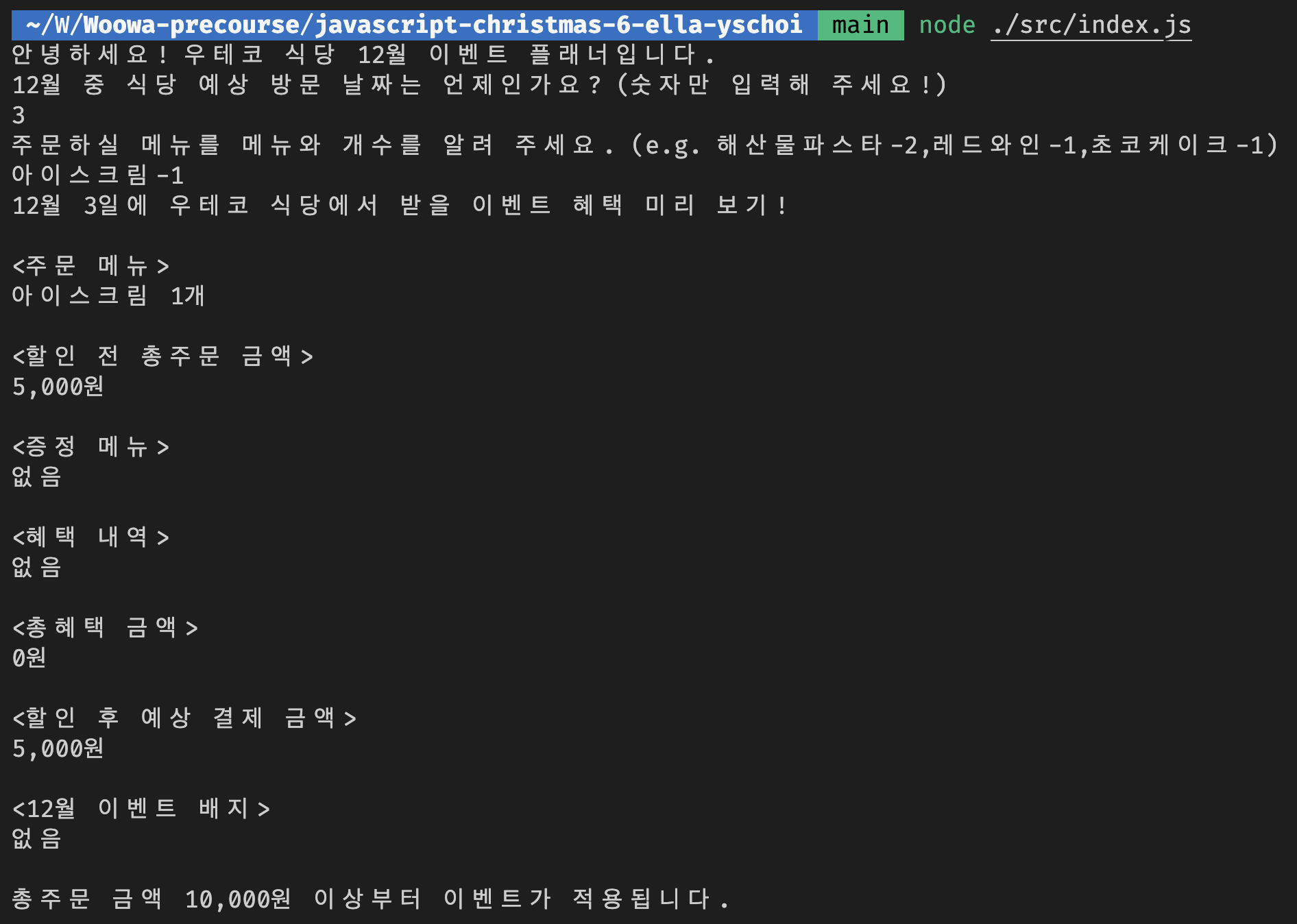 ๊ธฐ๋ฅ ๊ตฌํ์ ๋ชจ๋ ์ ์์ ์ผ๋ก ํ๋๋ผ๋ ์๊ตฌ ์ฌํญ์ ๋ช ์๋ ์ถ๋ ฅ๊ฐ ํ์์ ์งํค์ง ์์ ๊ฒฝ์ฐ 0์ ์ผ๋ก ์ฒ๋ฆฌ๋๋ค. ๊ธฐ๋ฅ ๊ตฌํ์ ์ ๋๋ก ํ๋๋ผ๋ ์ถ๋ ฅ ๊ฐ ํ์์ ์งํค์ง ์์ผ๋ฉด 0์ ์ด๋ผ๋ ์๋ฆฌ๋ค. ๊ธฐ๋ฅ ๊ตฌํ์ ์๋ฃํ ๋ค ํ ์คํธ๋ฅผ ์คํํ์ ๋ ํ ์คํธ๊ฐ ์คํจํ ๊ฒฝ์ฐ 0์ ์ผ๋ก ์ฒ๋ฆฌ๋๋ฏ๋ก, ๋ฐ๋์ ํ์ธ ํ ์ ์ถํ๋ค. ํ์๋ Node ํ๊ฒฝ์์ ํ๋ก๊ทธ๋จ์ด ์ ๋์๊ฐ๋์ง ํ์ธํ๊ณ , ๋ก์ปฌ ํ ์คํธ ์ฝ๋ ํต๊ณผ๊น์ง ํ์ธํ๋ค.