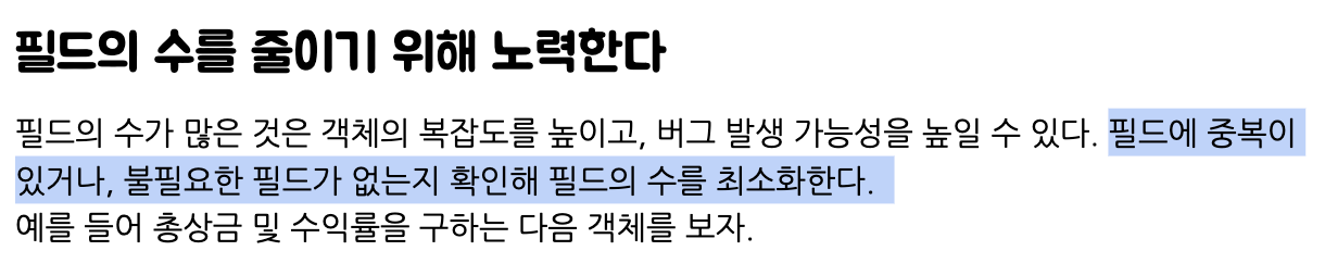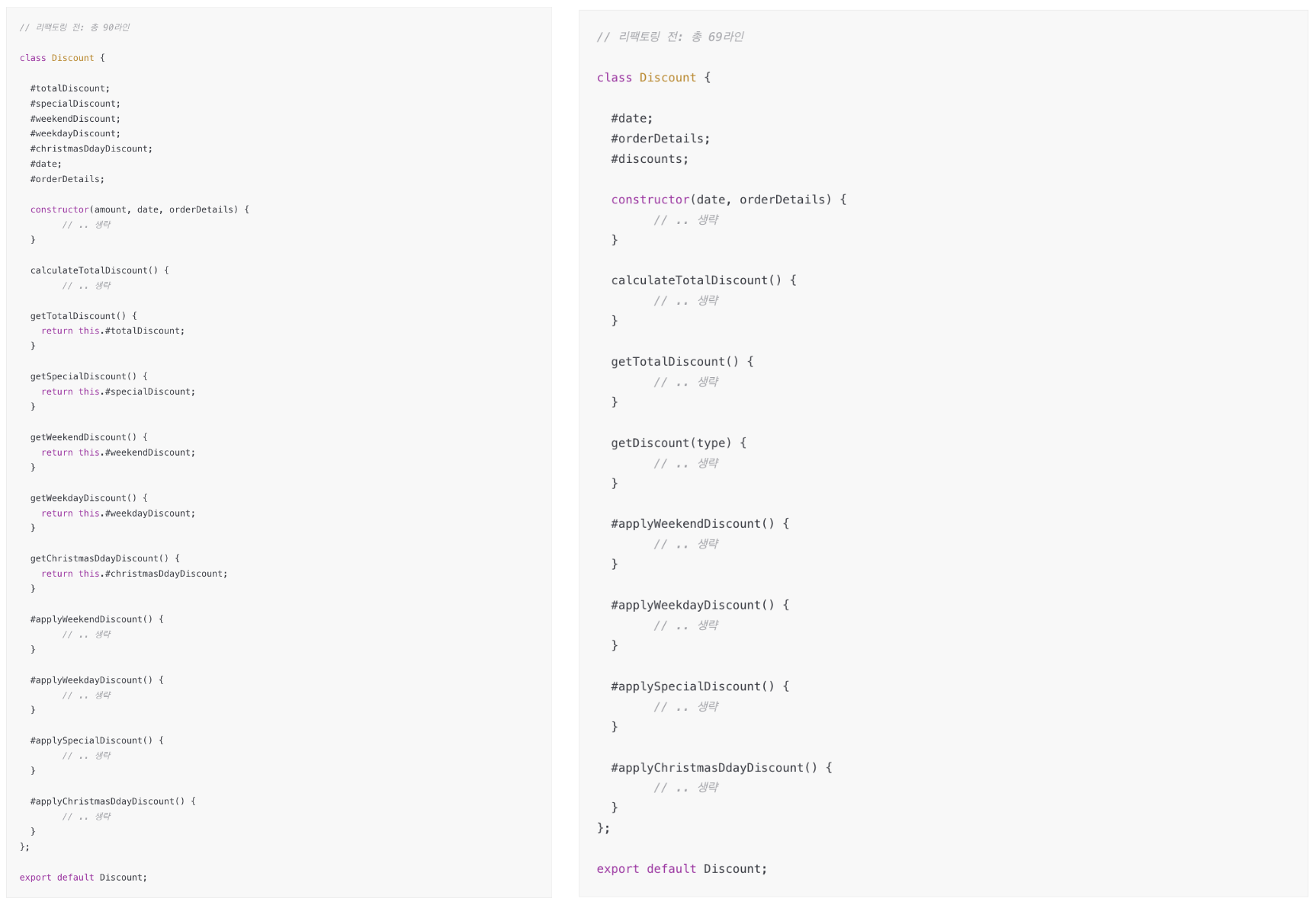 ์๋ฅผ ๋ค์ด, ์ฒ์์ Discount.js๋ผ๋ ๋๋ฉ์ธ ๋ชจ๋ธ๊ณผ ํต์ฌ ๋ก์ง์ ๊ตฌํํ ๋๋ ์๋จ์ ๊ฐ ํ ์ธ ์ ํ์ ๋ณ๋์ ํ๋๋ก ๊ด๋ฆฌํ๋ค. ์ฃผ๋ง ํ ์ธ, ํ์ผ ํ ์ธ, ํน๋ณ ํ ์ธ, ํฌ๋ฆฌ์ค๋ง์ค ํ ์ธ๋ค์ ๊ฐ๊ฐ์ ํ๋๋ก ๋์ดํ๊ณ , ๊ทธ ํ๋๋ฅผ getter๋ฅผ ํ์ฉํด ๊ฐ๊ฐ ๊บผ๋ด์ค๋ค ๋ณด๋ ๋ถํ์ํ๊ฒ ์ฝ๋๊ฐ ๊ธธ์ด์ก๊ณ ์ค๋ณต๋ ์ฝ๋๊ฐ ๋ง์์ง ๋๋์ด์๋ค.