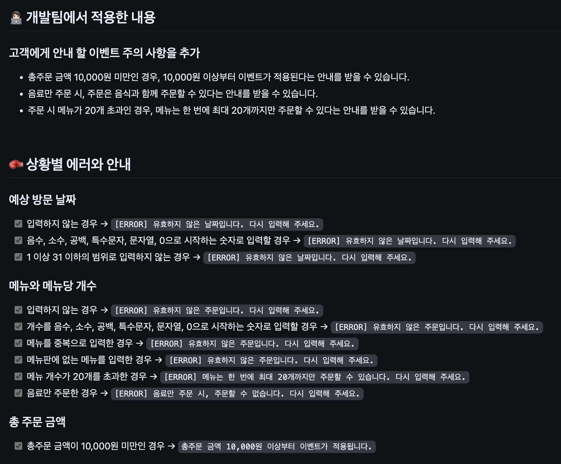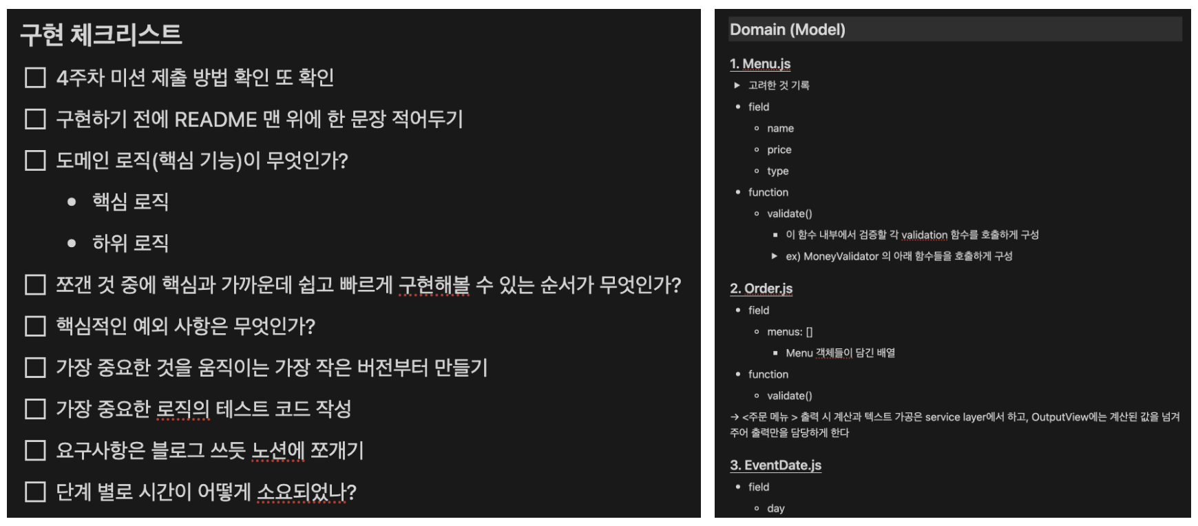 ๋ง์ง๋ง ๋ฏธ์ ์ธ ๋งํผ ์ง๋ 3์ฃผ๊ฐ ๋ฐฐ์ด ๊ฒ๋ค์ ๋ชจ๋ ๋ น์ฌ๋ด๊ณ ์ ํ๋ค. ์ด๋ฅผ ์ํด ์ง๋ 1์ฃผ ์ฐจ๋ถํฐ 3์ฃผ ์ฐจ๊น์ง์ ๋ชจ๋ ํผ๋๋ฐฑ๊ณผ ๊ต์ก ์๋ฃ๋ฅผ ์ด ๋ณต์ตํ๊ณ , ํ์ต ๋ด์ฉ์ ๋ฏธ์ ์ ์๊ตฌ์ฌํญ์ ์ ์ฉํ๋ฉฐ ์ค๊ณ์ ๊ณต์ ๋ง์ด ๋ค์๋ค. ์๋ฅผ ๋ค์ด, ๋ฉ๋ด / ์ฃผ๋ฌธ / ๋ฐฐ์ง ๋ฑ ๊ฐ ๊ฐ์ฒด๋ค์ด ๊ฐ์ง๋ ์ญํ ์ ๋ถ๋ฆฌํ์ฌ ํ์ํ ๋ฉ์๋๋ค์ ๋ฏธ๋ฆฌ ๊ณ ๋ฏผํ๊ณ ์ ์ด๋์๋ค.