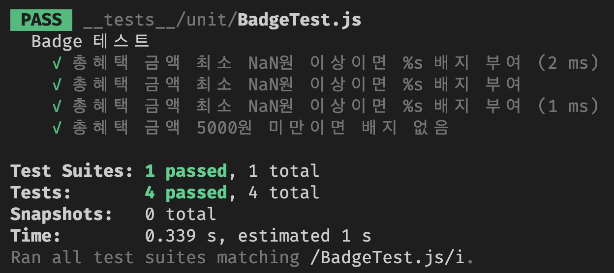 test.each(BADGES)('์ดํํ ๊ธ์ก ์ต์ %d์ ์ด์์ด๋ฉด %s ๋ฐฐ์ง ๋ถ์ฌ', ({ badge, amount }) => {