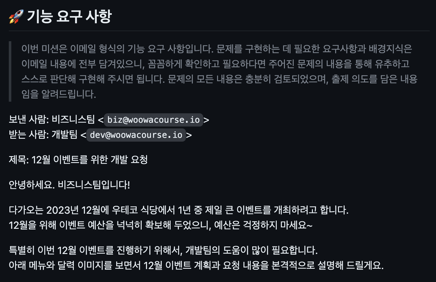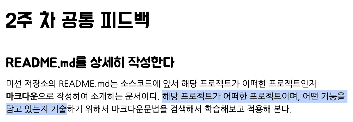 ๊ทผ๋ฐ ์ด์ฐ๋ณด๋ฉด ๋ฑ๋ฑํ(?) ์๊ตฌ์ฌํญ๋ณด๋ค ์ด๋ ๊ฒ ๋ฉ์ผ๋ก ๋ฐ์ผ๋๊น ์ง์ง ์ฐ์ํํ์ ๋ค ๊ฐ๋ฐํ์ ๊ฐ๋ฐ์๋ก ์ผํ๋ ๋๋์ด ๋ค์ด ์ข์๋ค. ๊ทธ๋์ ๋ด์น๊น์ README๋ ์ด๋ฉ์ผ ํ์์ผ๋ก ์จ๋ณด์๋ค. 2์ฃผ ์ฐจ ๊ณตํต ํผ๋๋ฐฑ์์ "ํด๋น ํ๋ก์ ํธ๊ฐ ์ด๋ค ํ๋ก์ ํธ์ธ์ง, ์ด๋ค ๊ธฐ๋ฅ์ ๋ด๊ณ ์๋์ง" ๊ธฐ์ ํ๋ผ๋ ๋ง์ด ๋ ์ค๋ฅด๊ธฐ๋ ํ๊ธฐ ๋๋ฌธ.