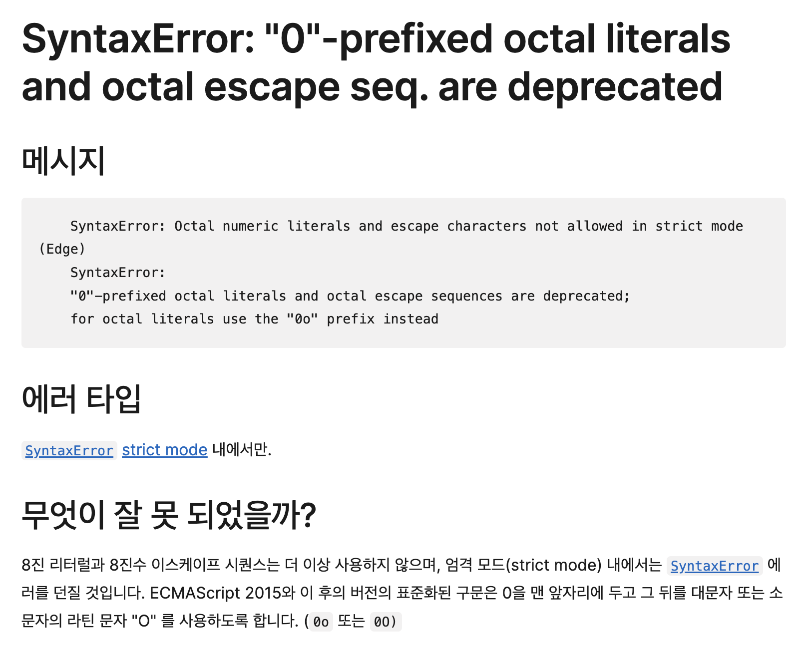 λ§μ§λ§μΌλ‘, λ 곡μμ μΈ MDNμμ μλ €μ£Όλ λ΄μ©λ μ°Ύμ보μλ€. μ λΈλ‘κ·Έ κΈμμ μ€λͺ ν κ²μ²λΌ μ격 λͺ¨λμμ 8μ§ λ¦¬ν°λ΄μ μλ¬λ₯Ό λμ§κΈ°μ μλ¬ λ©μμ§μμ μλ €μ€ ν΄κ²° λ°©λ²μ²λΌ 0μ 맨 μμ리μ λκ³ λλ¬Έμ Oλ μλ¬Έμ oλ₯Ό μμ±ν΄ '0O2'λ '0o2'μ κ°μ νμμΌλ‘ μ¬μ©νλΌκ³ μ μνλ€.