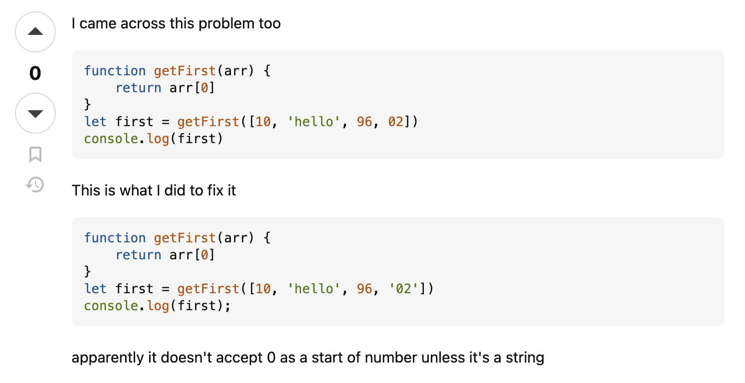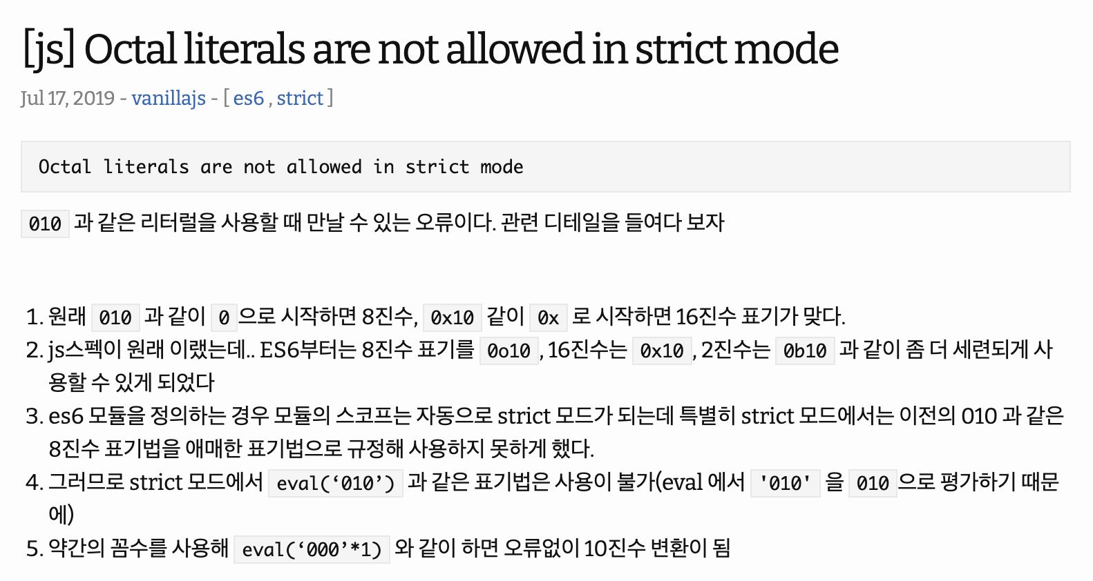 μ°μ 첫 λ²μ§Έλ‘ μ°Ύμλ³Έ λΈλ‘κ·Έ κΈμμ 0μΌλ‘ μμνλ Octal literalsμ JavaScript strict modeμμλ νμ©λμ§ μλλ€κ³ νλ€. ES6 λͺ¨λμ μ μνλ κ²½μ°, μ€μ½νλ μλμΌλ‘ strict modeκ° λλλ°, μ격 λͺ¨λμμλ 8μ§μ νκΈ°λ²μ μ λ§€ν νκΈ°λ²μΌλ‘ κ·μ νκΈ° λλ¬Έμ΄λ€.