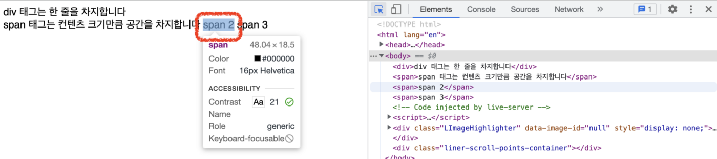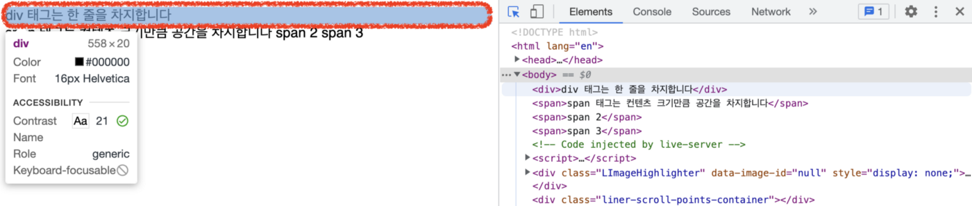 HTML์ ๊ณต๋ถํ๋ค๋ณด๋ฉด ํ๊ทธ๋ค ์ฌ์ด์ ์ฐจ์ด์ ์ด ๊ถ๊ธํ ๊ฒ๋ค์ด ์๋ค. ๋ํ์ ์ผ๋ก <div>์ <span>์ธ๋ฐ, ํ๋ฉด์ ์ผ๋ก๋ ๊ทธ๊ฒ ๊ทธ๊ฑฐ ๊ฐ์์ ํท๊ฐ๋ฆด๋งํ๋ค. ๊ฐ์ฅ ์ฝ๊ฒ ์ดํดํ๋ ๋ฐฉ๋ฒ์ ๊ตฌ๊ธ ํฌ๋กฌ์ ๊ฐ๋ฐ์ ๋๊ตฌ๋ฅผ ์ผ์ ๋ณด๋ ๊ฒ์ด๋ค.