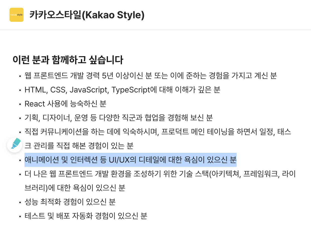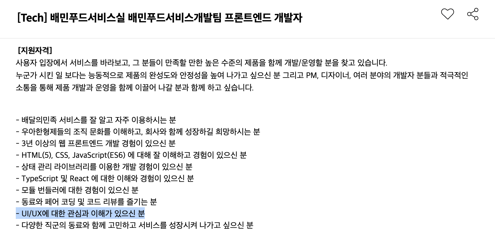 ์๋์ ๊ฐ์ด ํ๋ก ํธ์๋ ๊ฐ๋ฐ์ ์ฑ์ฉ ๊ณต๊ณ ์์๋ ์ง์์๊ฒฉ ํน์ ์ฐ๋์ฌํญ์ UI/UX์ ๋ํ ์ดํด๋ ๋ํ ์ผ ์ธก๋ฉด์ ํจ๊ป ๊ณ ๋ฏผํ ์ฌ๋์ ์ฐพ๊ธฐ๋ ํ๋ค. ์ฐ๋ฆฌ๊ฐ ์ด ์ญ๋์ ๊ฐ์ถ์์ ๋ ์์ฅ์์ ๊ฒฝ์๋ ฅ์ด ์์ ๊ฑฐ๋ผ๋ ์ด์ผ๊ธฐ๋ค.