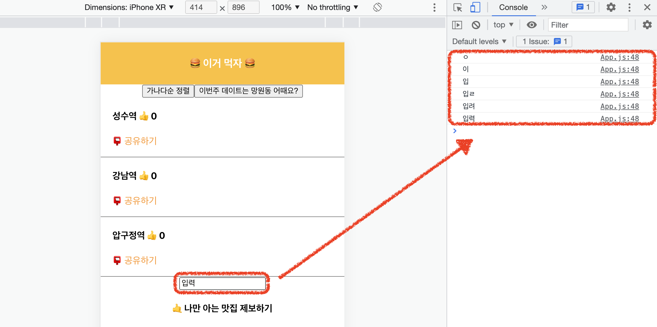 ์ฌ์ฉ์๊ฐ ์ ๋ ฅํ ๊ฐ์ ๋ณดํต ๋ณ์๋ state์ ์ ์ฅํด ๋๋๋ฐ, ์ฌ๊ธฐ์๋ state์ state ๋ณ๊ฒฝ ํจ์๋ฅผ ๋ง๋ค์ด์ ์๊น ์จ๋ console.log ๋ถ๋ถ์ ๋ฃ์ด์ฃผ์. ๊ทธ๋ผ ์ฌ์ฉ์๊ฐ ์ ๋ ฅํ ๊ฐ์ด state์ ์ ์ฅ๋๋ค.