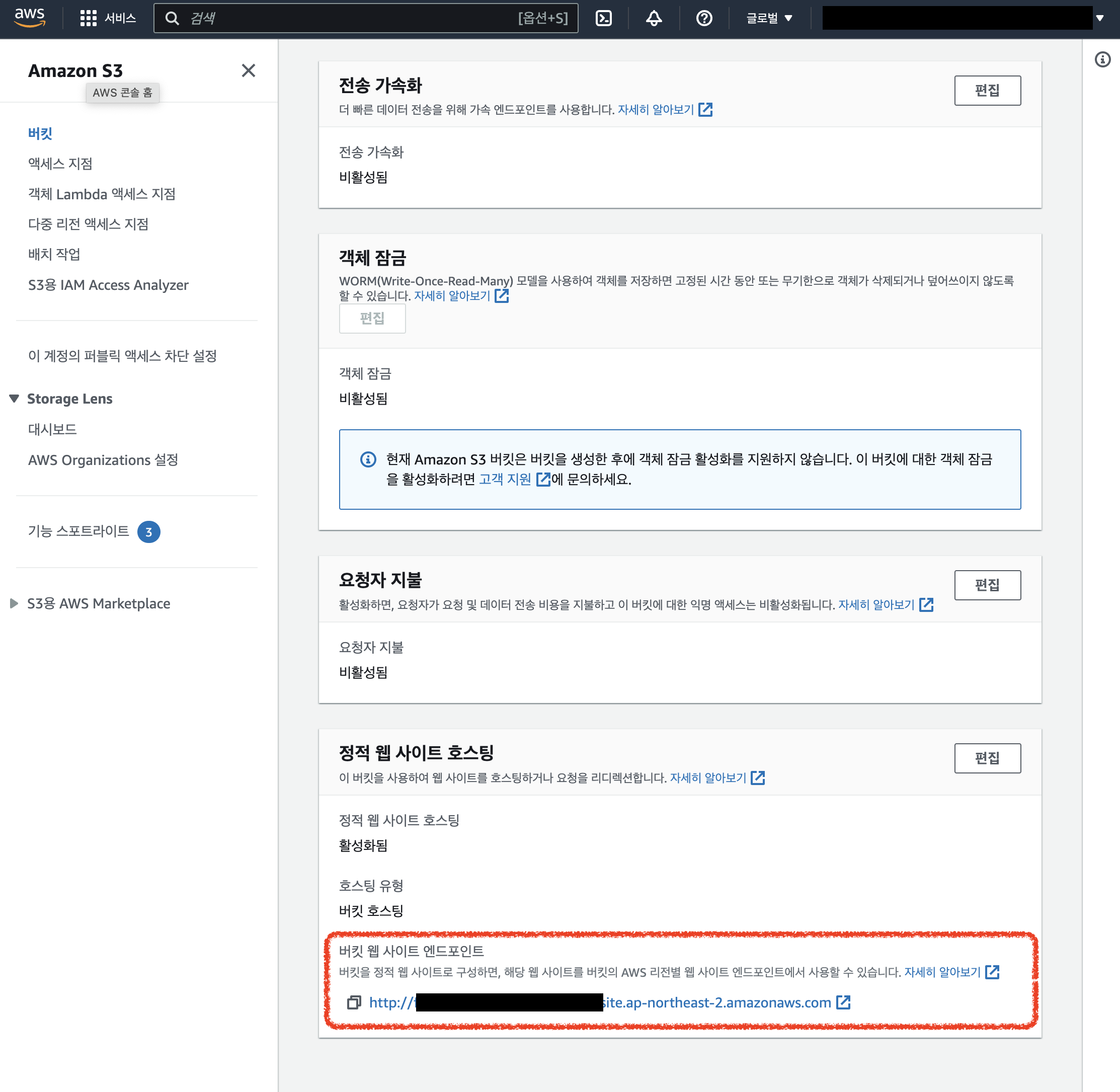 AWS > S3 > ๋ฒํท > ์์ฑ > ์์ฑ ํ์ด์ง ๋งจ ํ๋จ์ '๋ฒํท ์น ์ฌ์ดํธ ์๋ ํฌ์ธํธ'๋ฅผ ํด๋ฆญํ๋ฉด