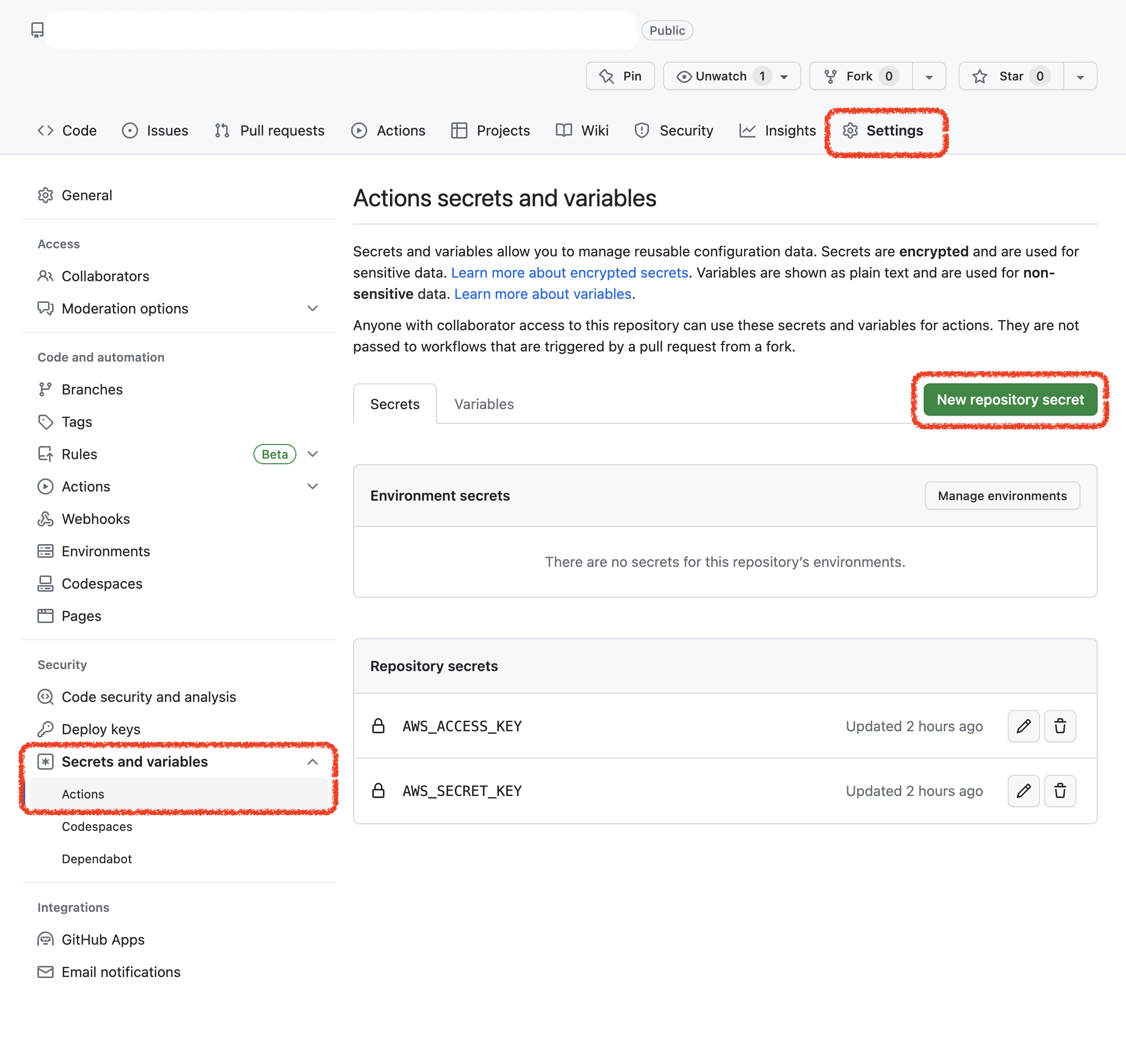 (1) Github์ ํด๋น ๋ ํฌ์งํ ๋ฆฌ > Settings > ์ข์ธก์ Secrets and variables > Actions > [New repository secret]์ ๋๋ฌ AWS์์ ๋ฐ๊ธ๋ฐ์ ํค๋ฅผ ๋ฑ๋กํ๋ค.